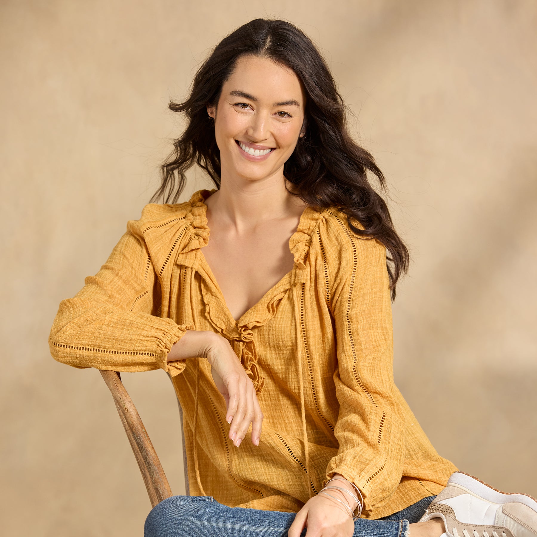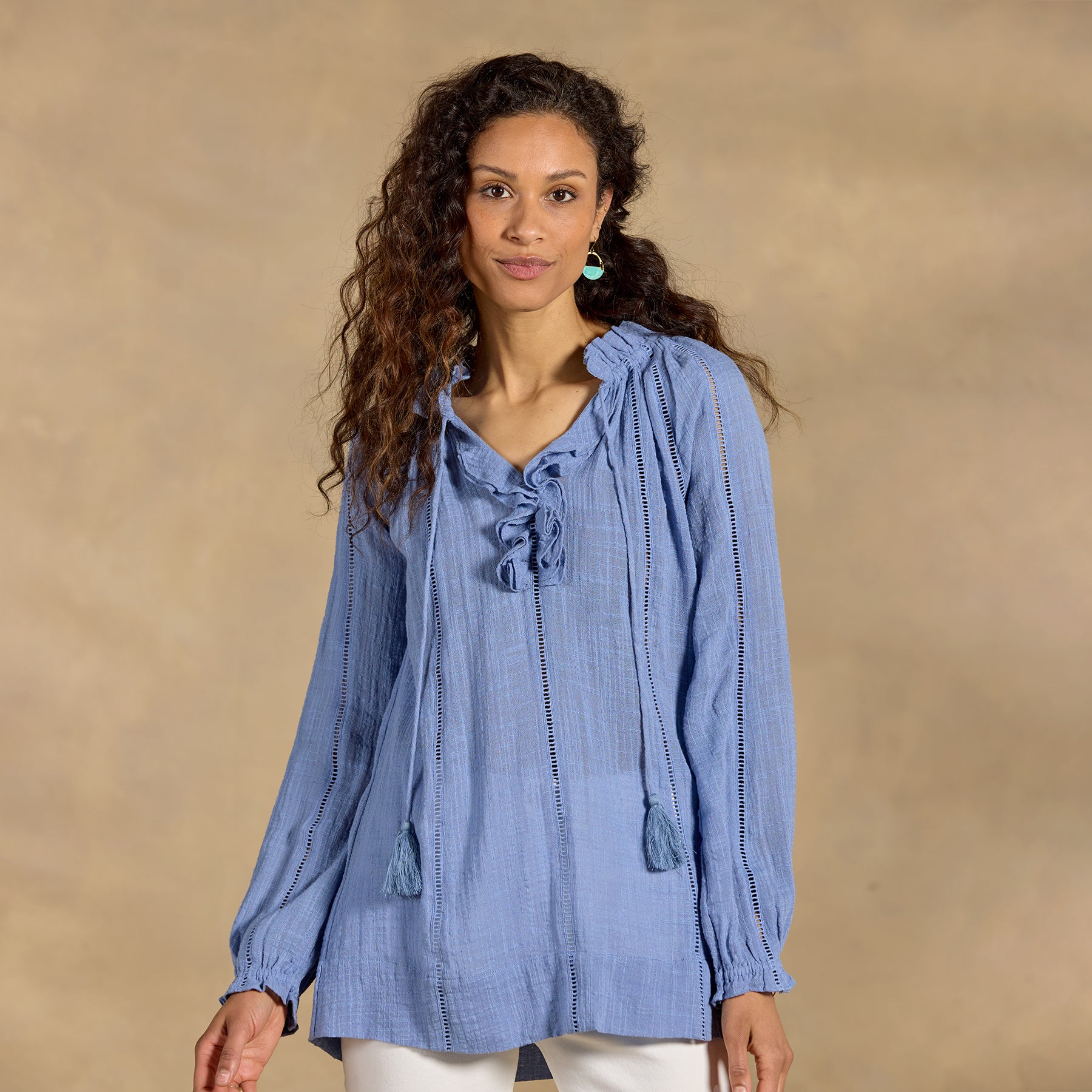 Embrace your artistic spirit in our sheer. easy-fit top with ladder lace. ruffle neckline and tassel ties. Cotton/viscose. Hand wash. Imported. Exclusive. Sizes XS (0–2). S (4–6). M (8–10). L (12–14). XL (16–18). XXL (20–22). Approx. 26.5l