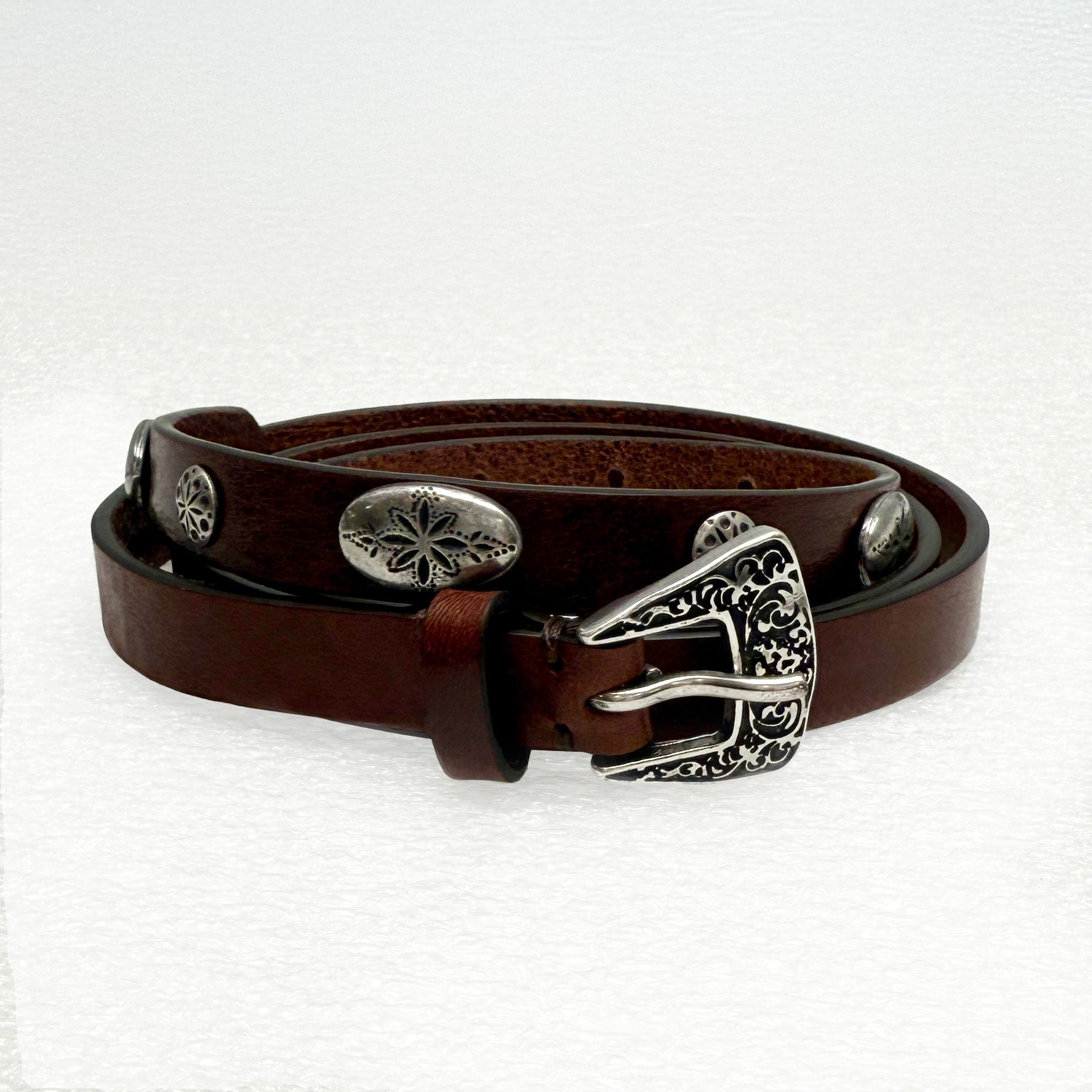 Dark brown leather belt with metal studs. Sizes XXS (29.5). XS (31.5). S (33.5). M (35.5). L (37.5) Approx. .5 w.