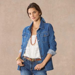 Classic denim detailing in a safari-inspired style gives our fun jacket a vintage vibe. Fitted. with four pockets. self tie and antiqued copper button front. Cotton. Machine wash. Imported. Exclusive. Sizes XS (0?C2). S (4?C6). M (8?C10). L (12?C14). XL (16?C18). XXL (20?C22). Approx. 27.5l.