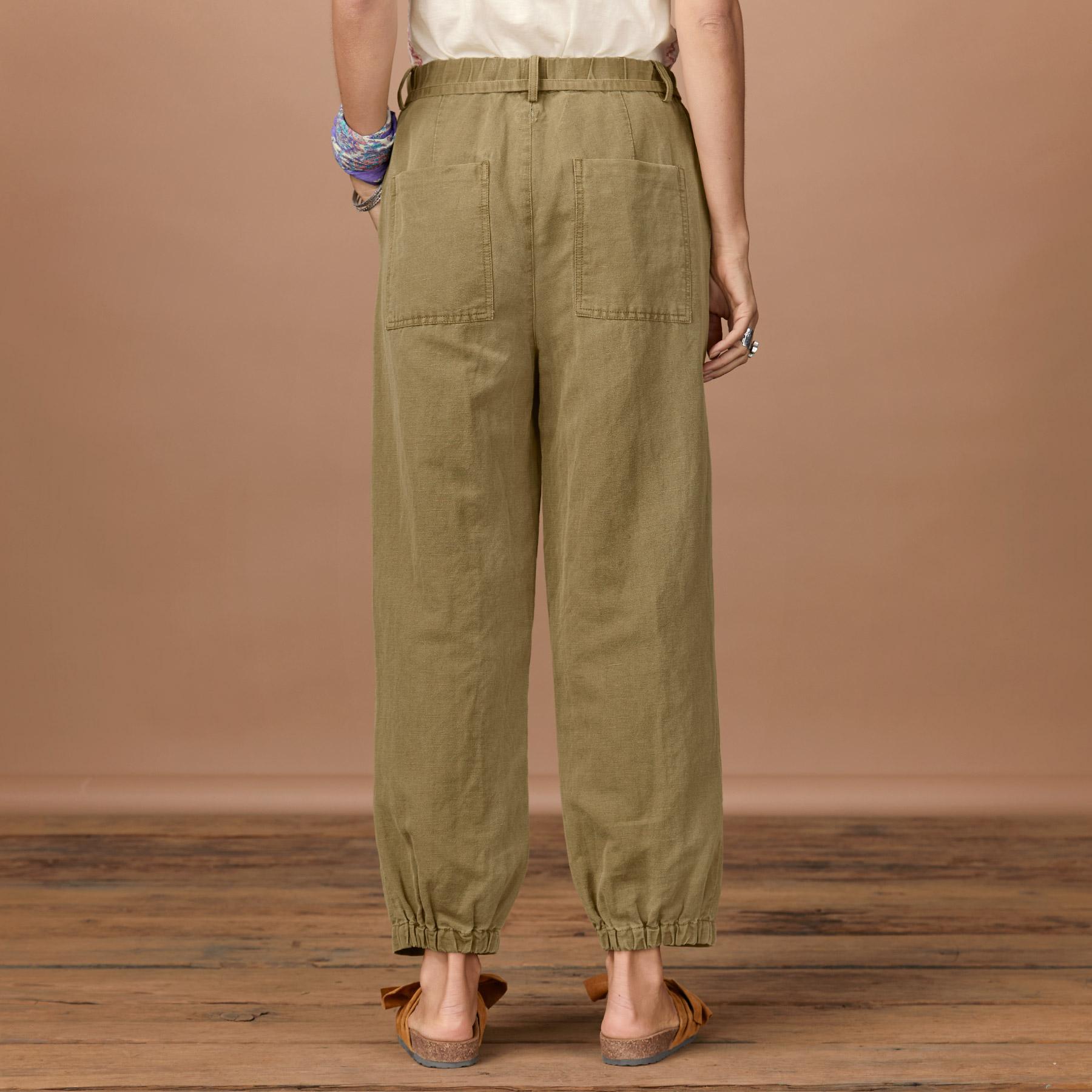 Step into comfort with our relaxed fit barrel leg pants with easy flat front and elastic back waist for the perfect fit. Front pintuck details. two front slash pockets. two back patch pockets and a removable waistband tie. Cotton/linen. Machine wash. Imported. Exclusive. Sizes 0-14. 24.5 inseam.