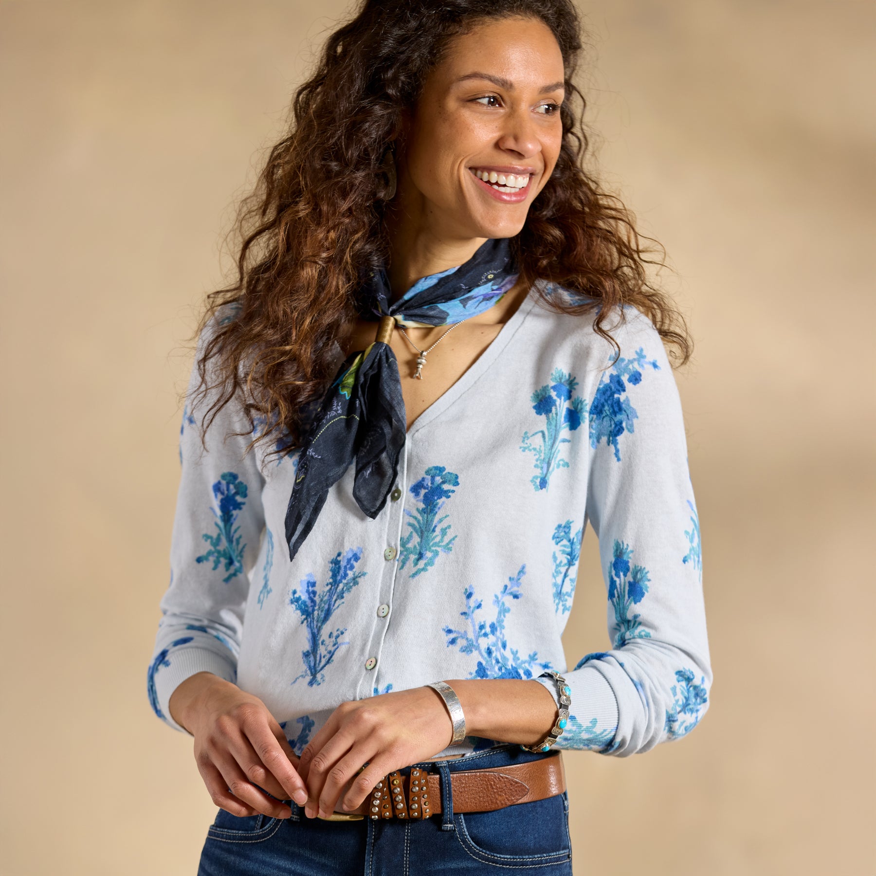 A woven garden party. the Larkspur Cardigan features a flattering fitted shape in a featherweight knit festooned with a feminine floral print. Cotton/linen. Hand Wash. Imported. Exclusive. Sizes XS (0–2). S (4–6). M (8–10). L (12–14). XL (16–18). XXL (20–22). Approx. 22l.