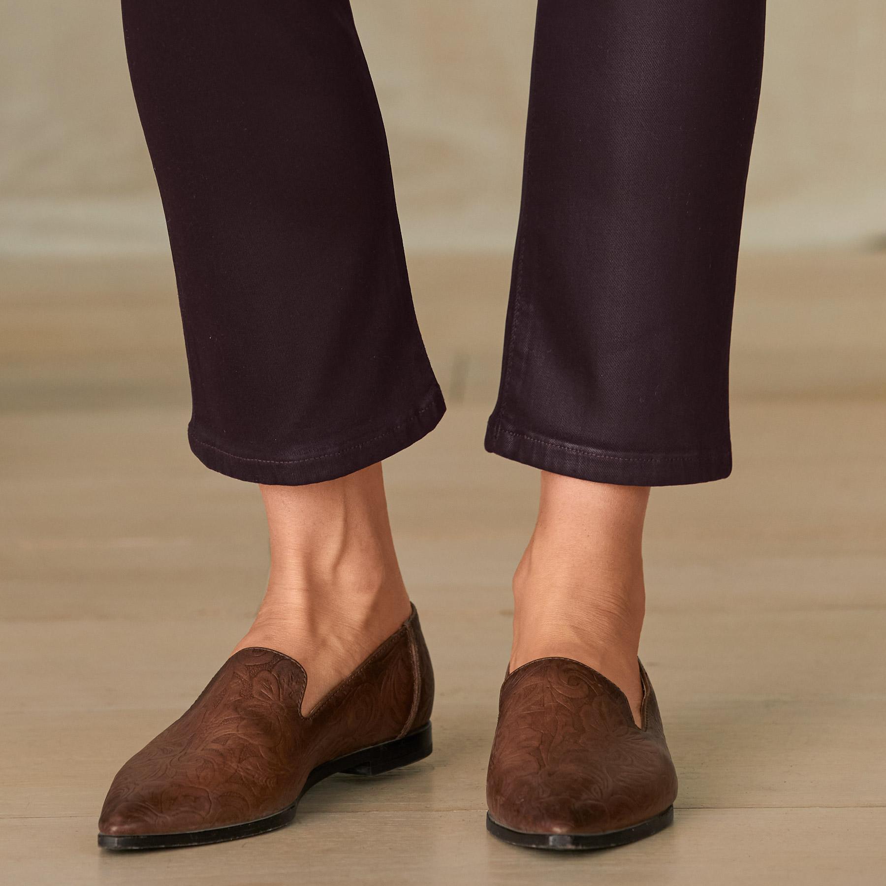 Straight leg styling. faux front pockets and a waxed coating come together for comfort and refinement. Machine wash. Imported. Sizes 24 to 32. 27 inseam; 10 rise; 14.25 leg opening. These jeans run one size small. it is recommended to size up.