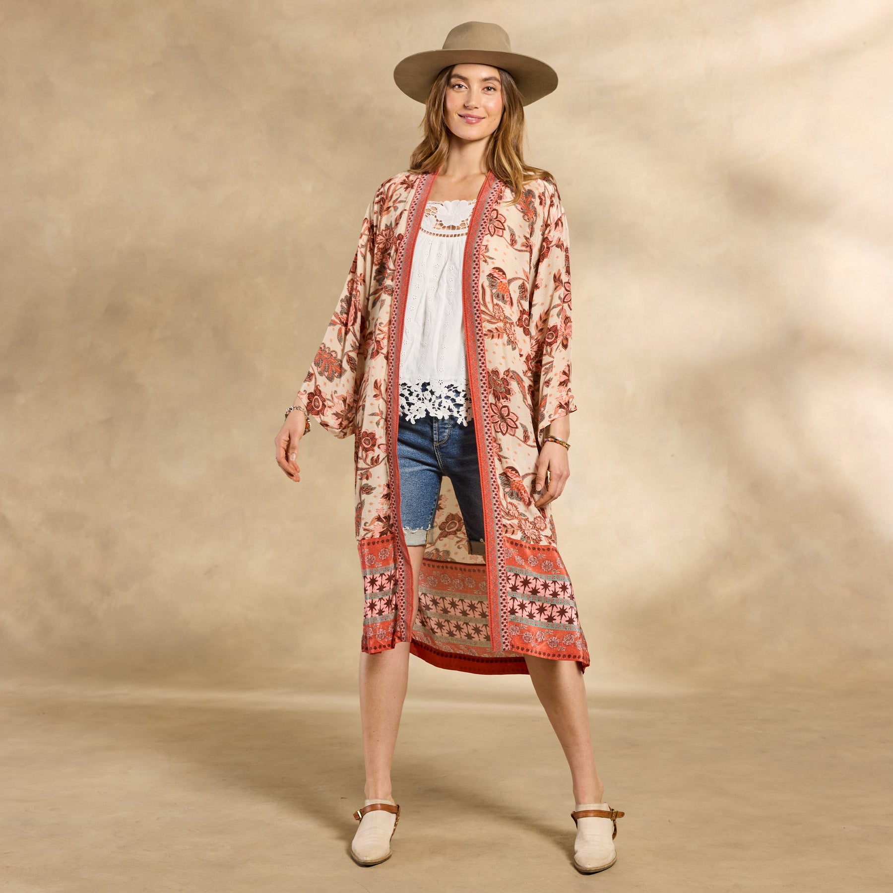 From morning coffee on the patio to apr??s-beach time and beyond. our easy. open-front kimono elevates your every day. With an elegant drape that will make you feel beautiful. charming border print and side-seam pockets. Viscose. Machine wash. Exclusive. Sizes XS (0?C2). S (4?C6). M (8?C10). L (12?C14). XL (16?C18). XXL (20?C22). Approx. 43.5l.