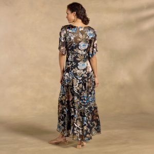 This stunning. iridescent. burnout velvet dress features a v-neck. short sleeves and tie at the waist. Slip included. Viscose/silk/polyester/spandex. Dry clean. Imported. Exclusive. Sizes XS (0?C2). S (4?C6). M (8?C10). L (12?C14). XL (16?C18). XXL (20?C22).