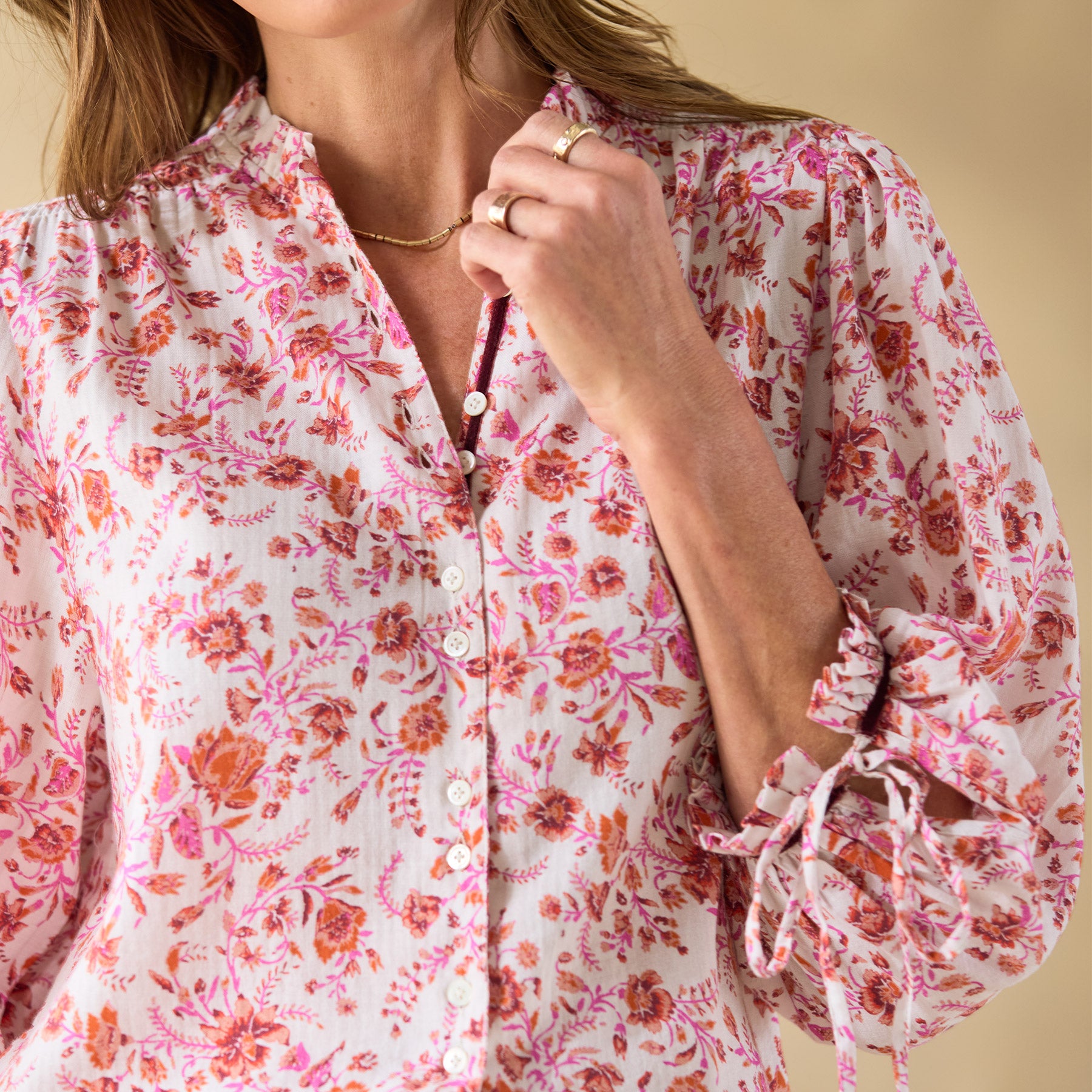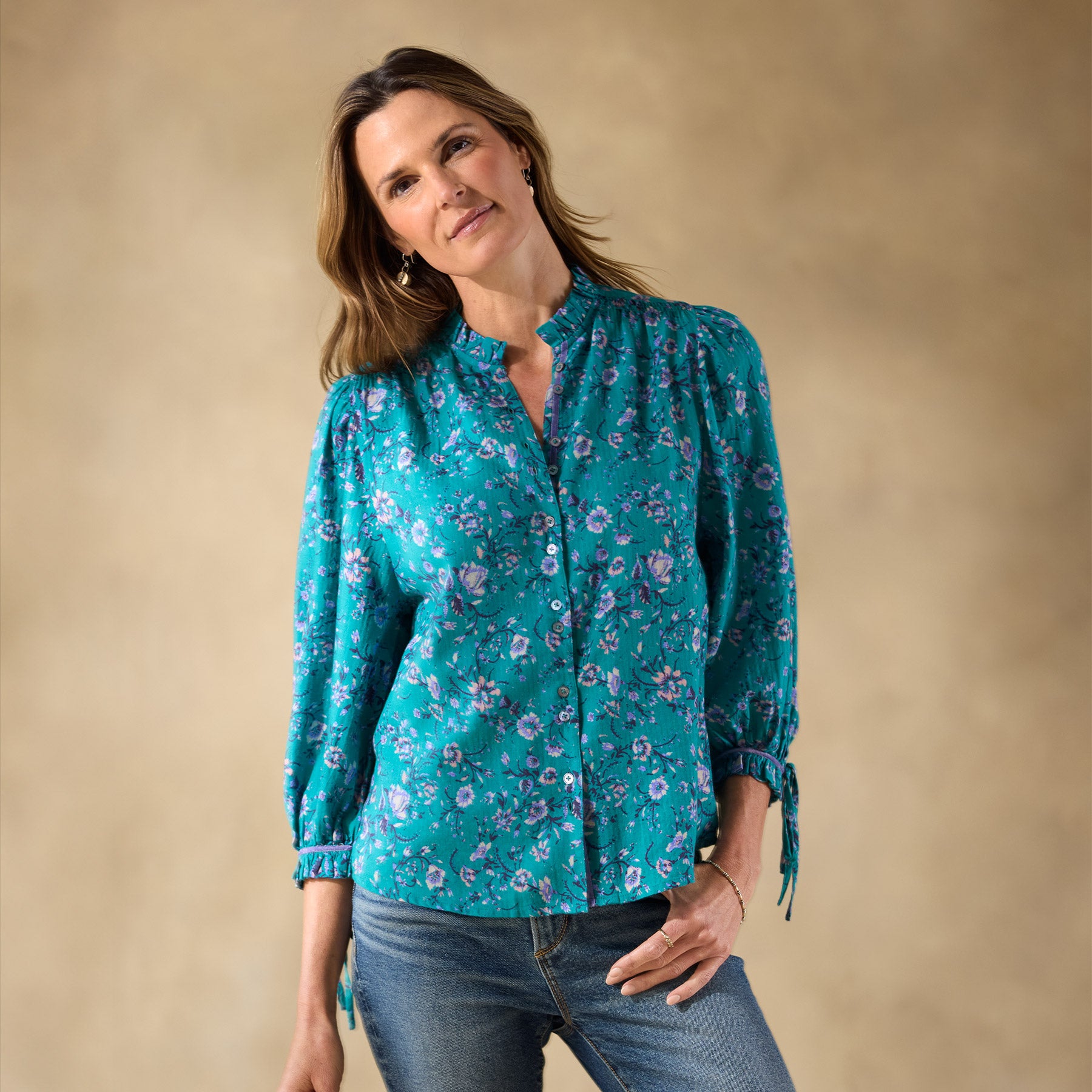 So easy—our feminine top is as beautiful as it is relaxed with button-down front. ruffle details at the neckline and bracelet length cuffs. contrast velvet trim and two lovely rows of smocking. Adjustable ties at the cuffs. Cotton. Machine wash. Imported. Exclusive. Sizes XS (0–2). S (4–6). M (8–10). L (12–14). XL (16–18). XXL (20–22). Approx. 25l.