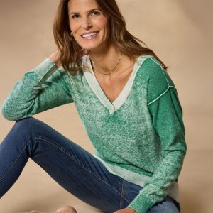Reverse printed for a casual. faded look. our relaxed-fit sweater boasts an alluring V-neck front and back. exposed seaming details. rib trim and side slits. Subtle hi-lo hem. Cotton. Hand wash. expect dye transfer or loss. Imported. Exclusive. Sizes XS (0?C2). S (4?C6). M (8?C10). L (12?C14). XL (16?C18). XXL (20?C22). Front approx. 23l.
